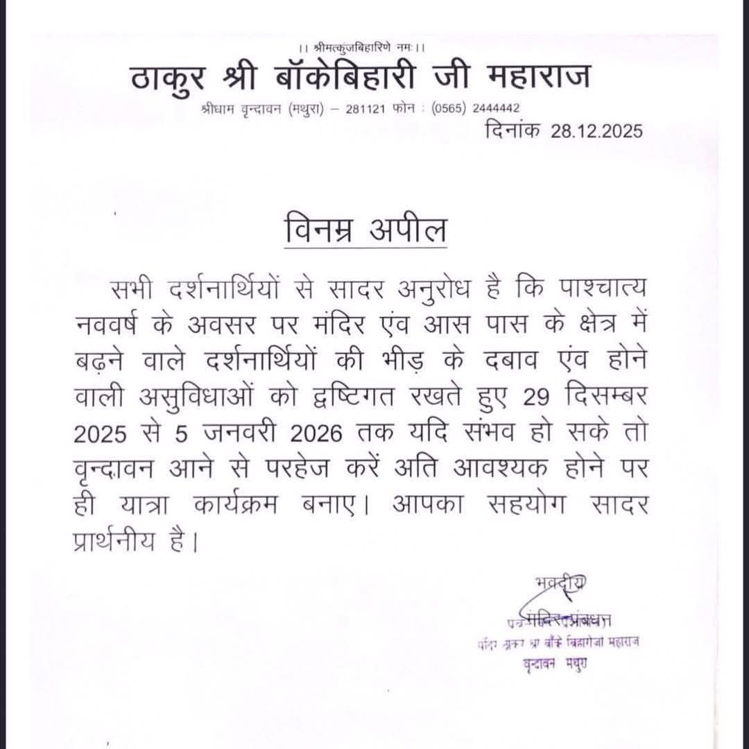 Posted inUttar Pradesh ब्रेकिंग न्यूज_मथुरा-वृंदावन में अत्यधिक भीड़ बढ़ जाने के कारण ठाकुर श्री बांके बिहारी जी महाराज मंदिर प्रशासन ने भक्तों से 29 दिसंबर से 5 जनवरी तक मंदिर न आने कि अपील Posted by Vipin Mittal December 29, 2025No Comments Vipin Mittal Journalist View All Posts Post navigation Previous Post थाना कोतवाली औरैया क्षेत्रान्तर्गत हुई पुलिस मुठभेड के सम्बन्ध में पुलिस अधीक्षक अभिषेक भारती औरैया द्वारा दी गयी जानकारीNext Postब्रेकिंग लखनऊ-